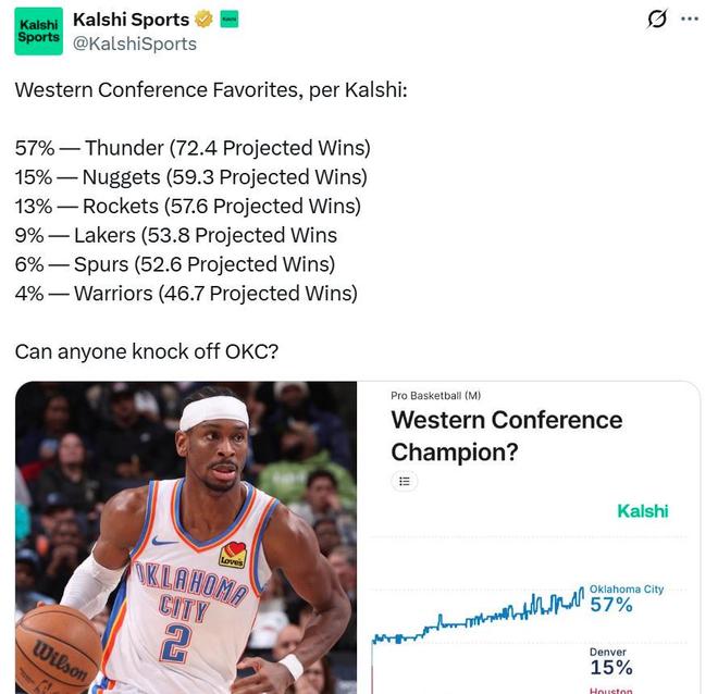 火箭队13%位列第三名!美媒Kalshi Sports公布西部冠军概率,其中勇士4%湖人9%,卫冕冠军雷霆断档高居第1。