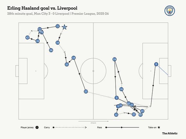 当哈兰德头球顶入马特乌斯-努内斯的传中时,这意味着曼城所有10名外场球员都在这次纵贯全场的推进中触球了。整整20脚传递才造就了这次右路传中,而这次进攻片段也浓缩了主队在上半场的统治力,他们总能神奇地多出一名接应点,从而化解了利物浦施加的任何压迫。